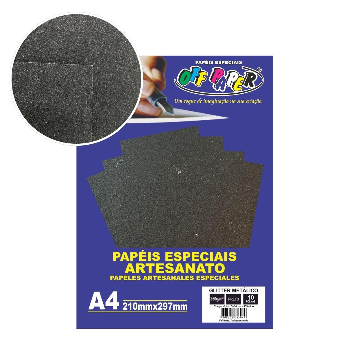 Papel Glitter Metálico Preto 250g c/ 10 Fls A4 Offpaper